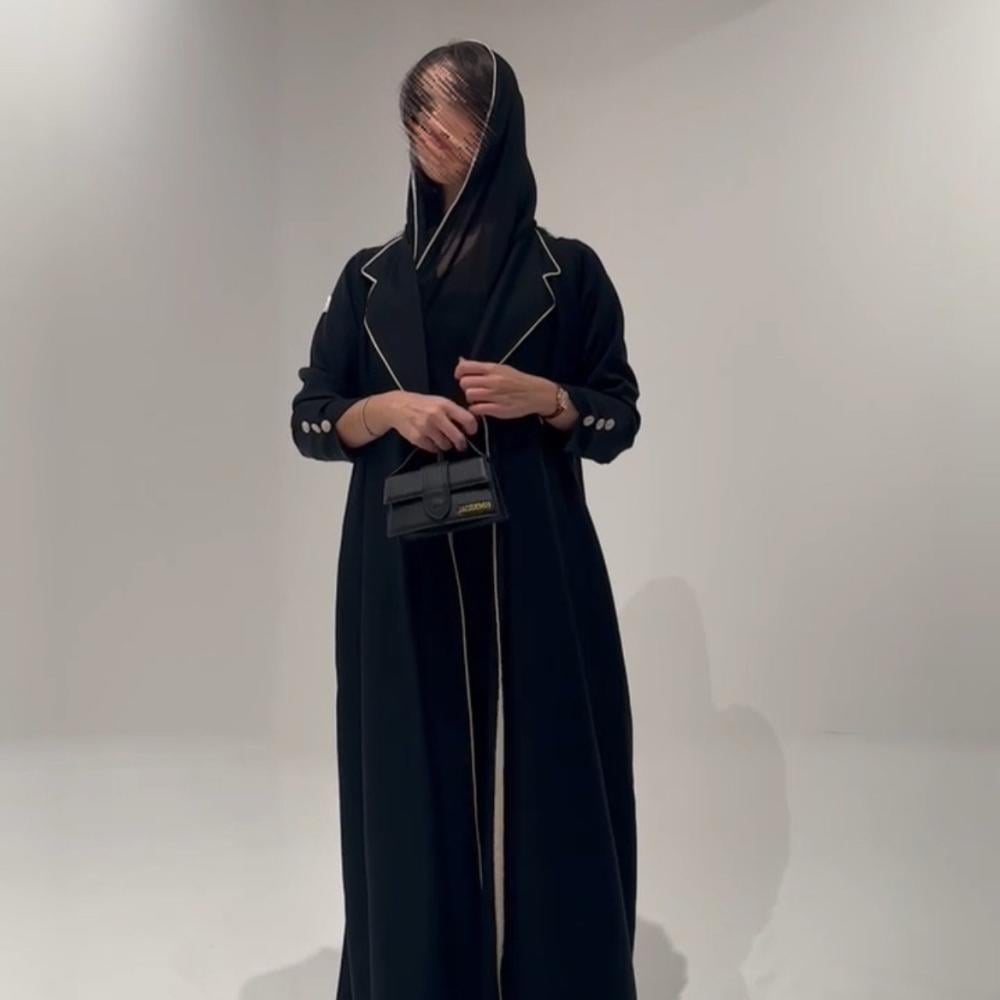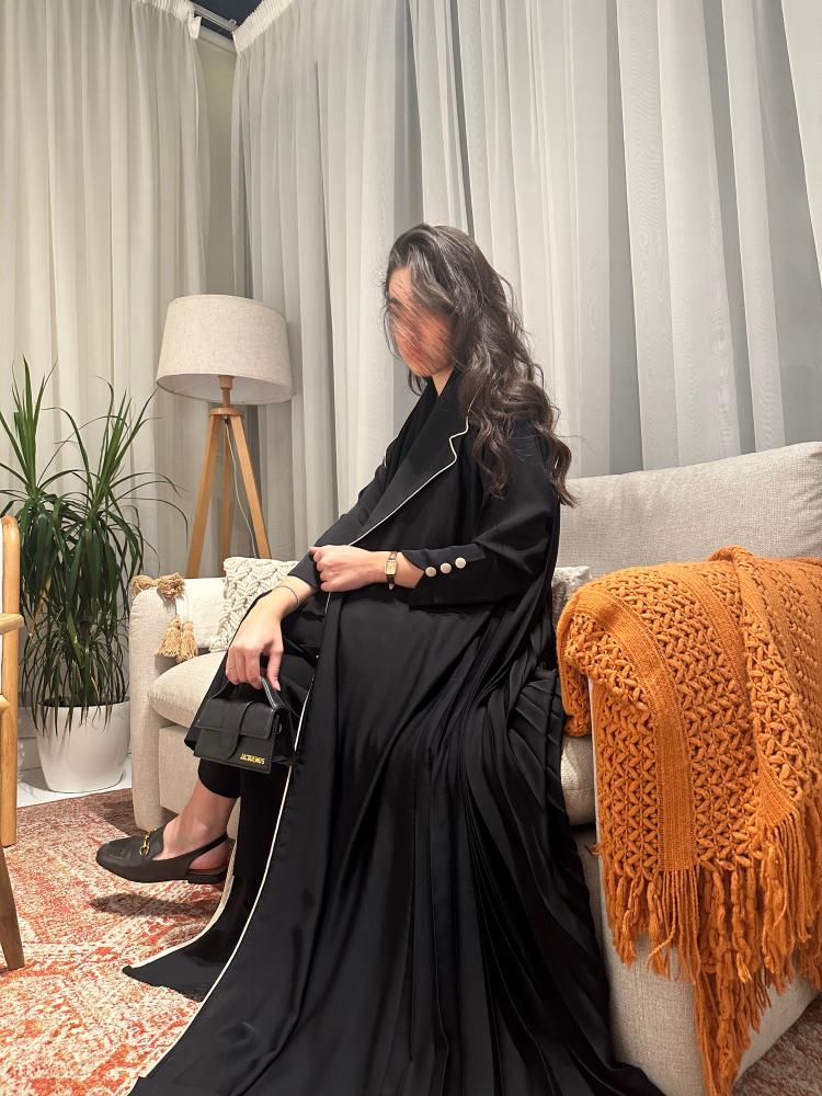 التفاصيل : كريب اسود ، دبل كلوش ، كسرات كامله من الخلف ، تحديد بيج ، السعر شامل الطرحة