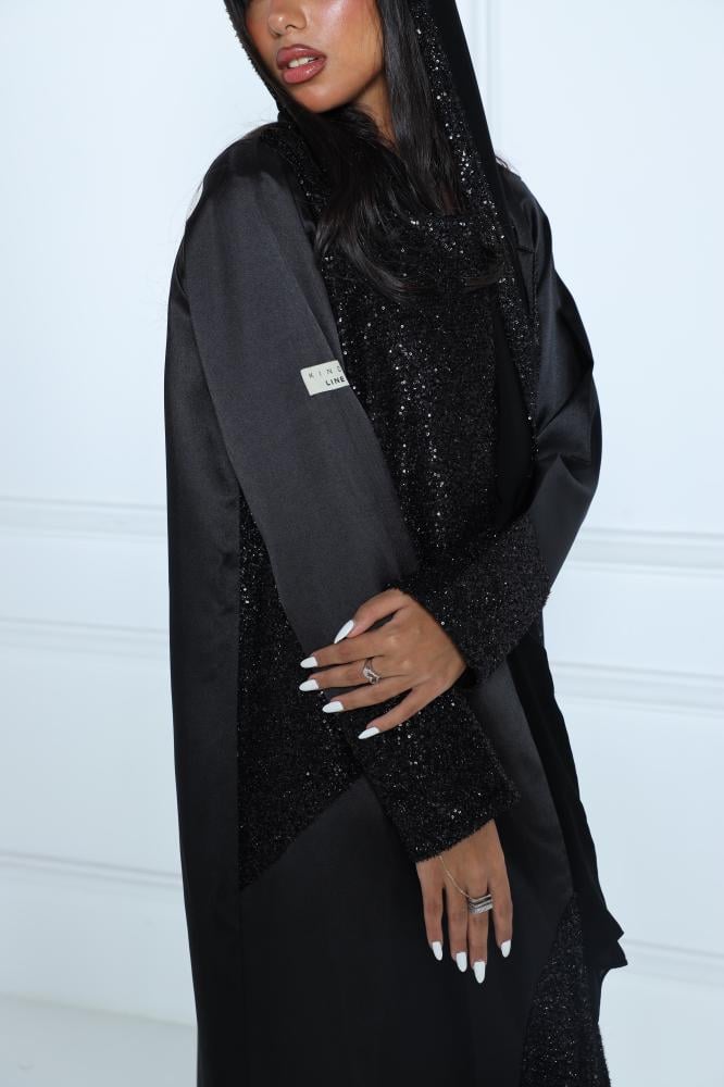 التفاصيل : تفتة اسود فاخر ، ترتر اسود من الأمام ، ترتر اسود في الأكمام ، القصة A ، القصة دائرية من الأعلى ا، طرحةبأطراف ترتر اسود